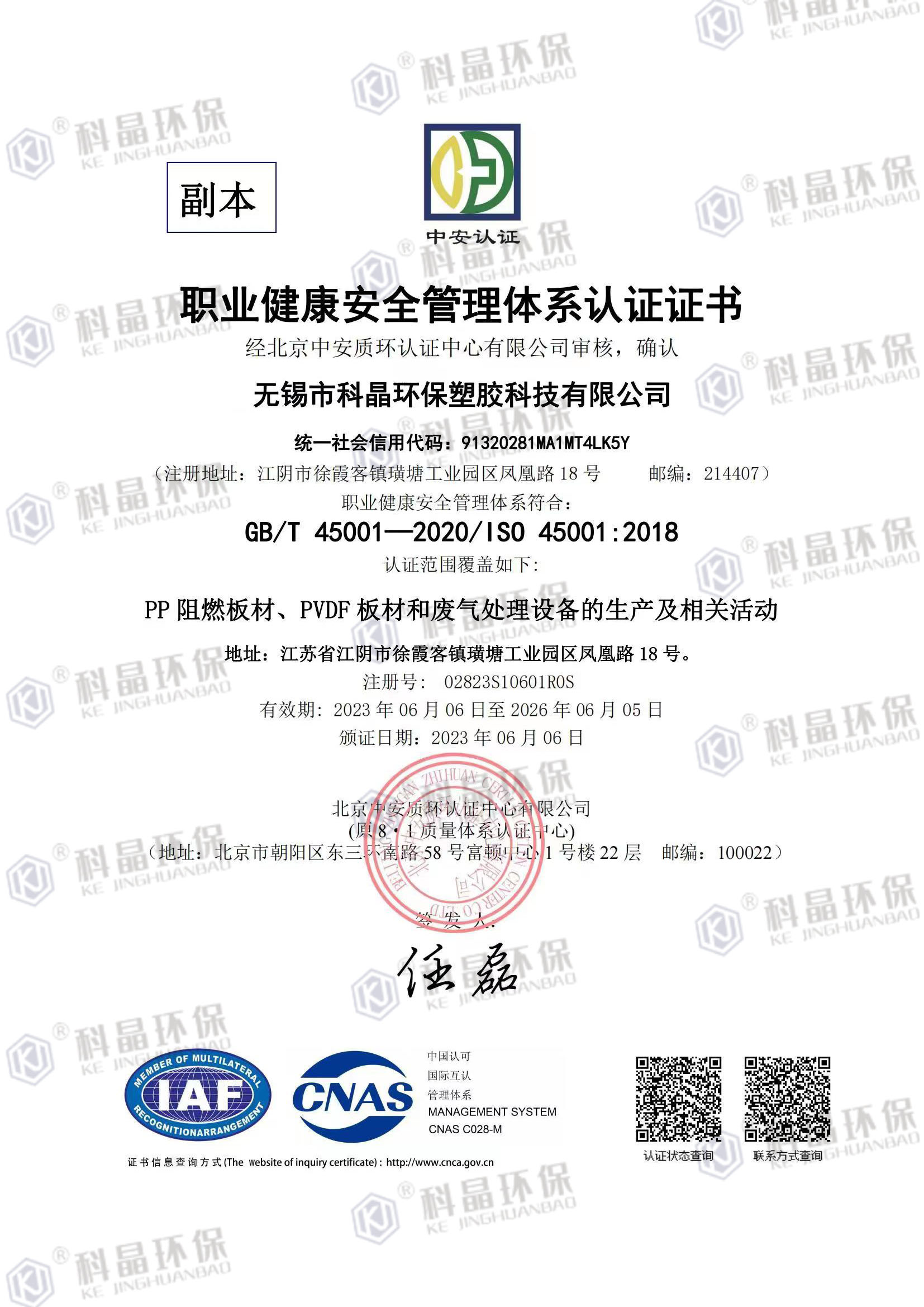 職業(yè)健康安全管理體系認證證書